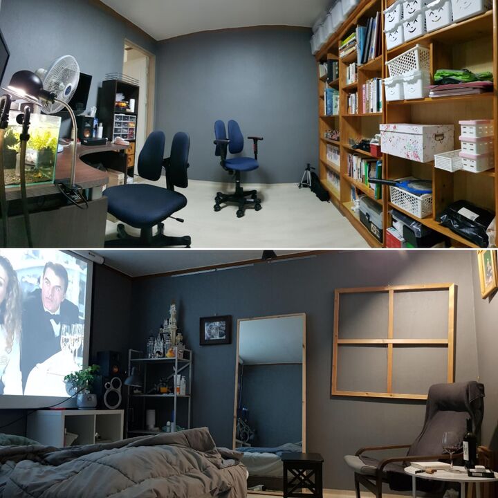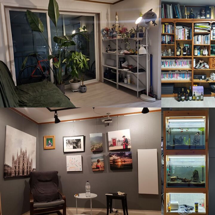 저희 집 거실에는 식물과 어항, 자전거가 있고, 큰 방에는 빔프로젝터와 제가 찍은 사진들이 걸려있습니다. 서재에는 술들과 3D프린터가 있고, 옷방에는 카메라와 스키, 스노우보드 같은 잡동사니가 있습니다.