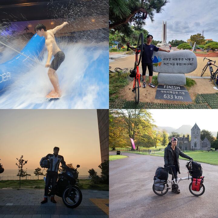 이것저것 하는 걸 좋아해서 자전거를 타고 부산까지 갔고, 유럽도 자전거를 들고 다녔으며, 오토바이 타는 것도 좋고, 스쿠버다이빙 자격증이 있고, 스카이다이빙, 번지점프, 서핑을 해봤어요. 요즘 트라이애슬론을 하기 위해 수영을 열심히 하고 있습니다.